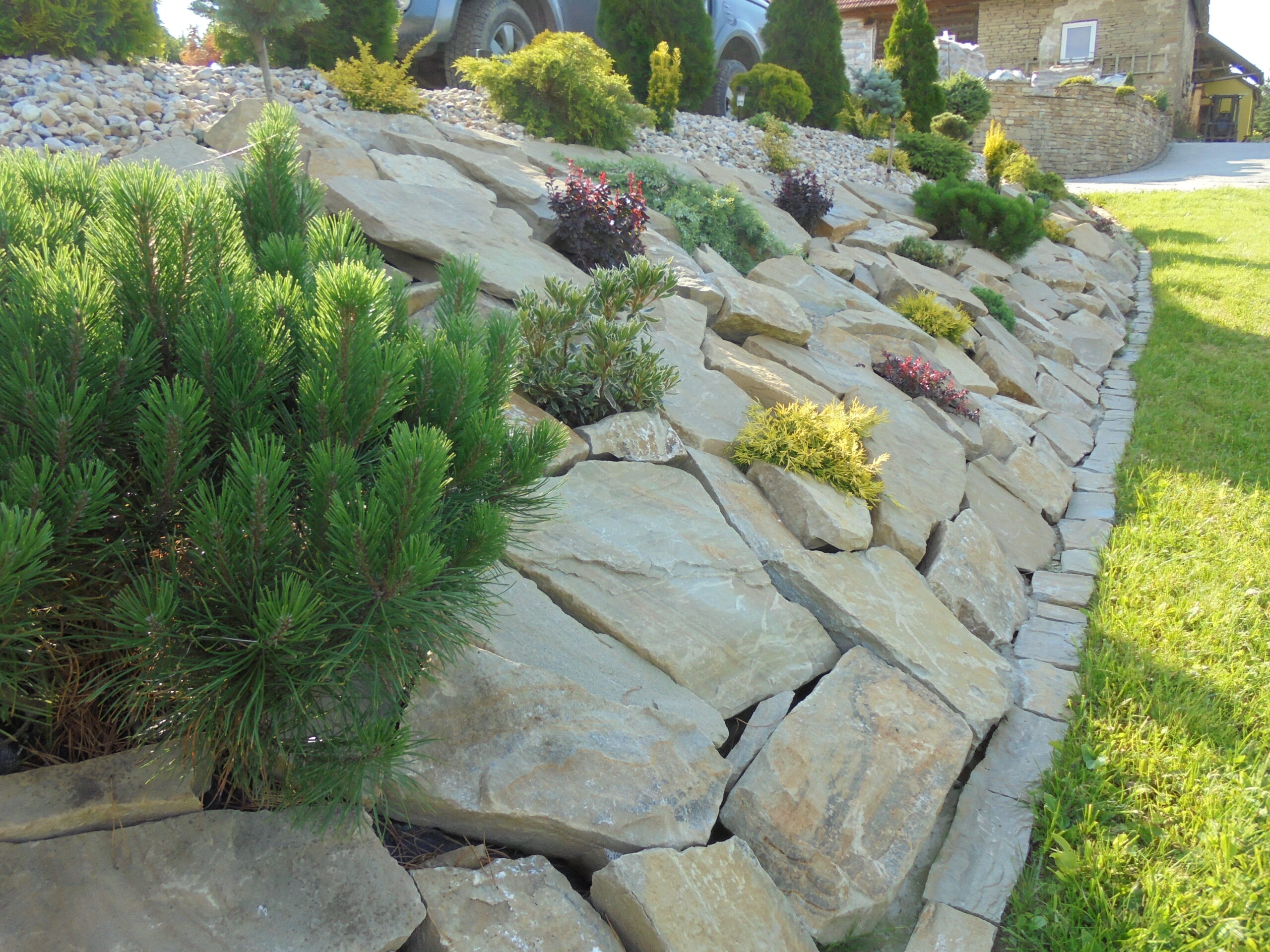 - Ogród rustykalny: Kamień w stylu naturalnym, np. piaskowiec będzie pasować do ogrodu w stylu wiejskim, pełnym roślinności.